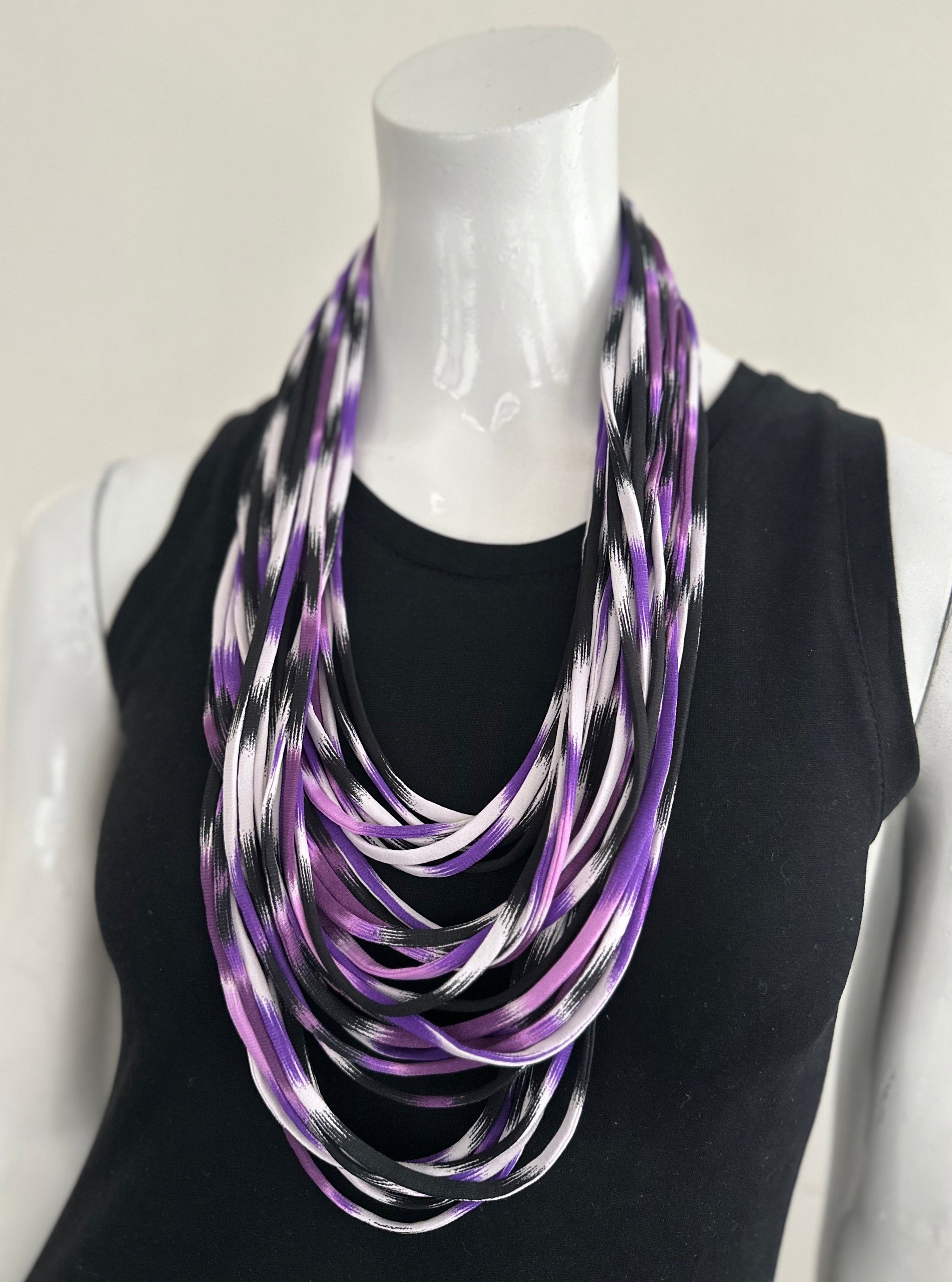 This purple infinity scarf necklace features a harmonious ombre blend featuring shades of purple. Available in two color options.